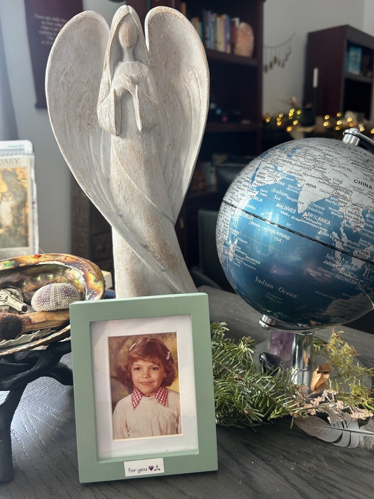 I wondered about my ancestors and the traumas and hardships they endured. I vowed to heal for them. I forgave everyone, especially myself. I journaled and gave permission to all of my parts to communicate with me whenever they wanted, especially the shameful parts. I joined sisterhood circles & overnight healing retreats, practiced self healing methods like Reiki, heart-opening practices, and enrolled in courses to deepen my intuition & connection to self. I created an alter space where I connect daily with my higher self and gracing this space are candles, items from nature, a globe so I can send healing intentions to the world, my Tarot cards, smudging tools and a sweet little pic of me when I was 5 years old. Under the pic are two words: “for you” as my eternal vow to her. It turns out my family & friends are still here and enormously proud of me, but nobody is prouder than that little girl in the picture.